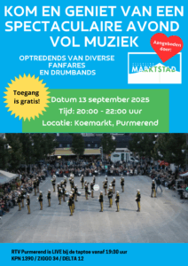 Mis deze unieke TAPTOE niet tijdens de Nazomerfeestweek in Purmerend. Kom naar de Koemarkt tussen 19:30 uur en 22:00 uur en laat je betoveren door de prachtige klanken van de blaasorkesten. Het wordt een avond vol muzikaal spektakel en entertainment.